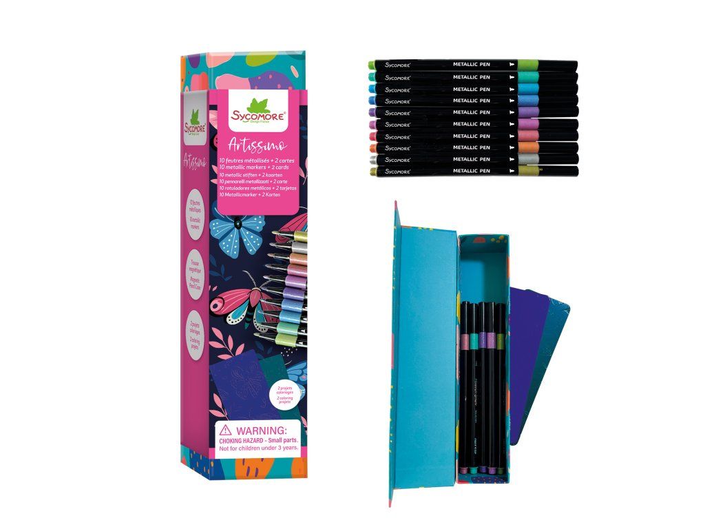 Tato kreativní sada obsahuje 10 metalických fixů v zářivých a třpytivých barvách, které jsou ideální pro vytváření ohromujících efektů na vašich uměleckých výtvorech. Součástí balení jsou 2 omalovánky, které vám umožní si fixy hned vyzkoušet. Perfektní fixy pro začínající umělce od 7 let!Doplňkové parametry