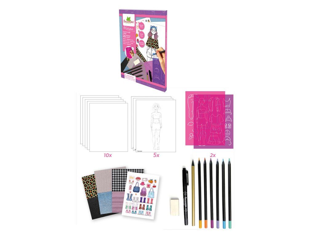 Sada obsahuje vše potřebné: 10 tištěných stránek s připravenými siluetami, na které můžete navrhnout vlastní oblečení, 10 prázdných stránek pro volné kreslení a tvorbu, 6 barevných pastelek pro precizní detaily a barevné kombinace ,1 tužka HB pro kreslení a stínování, 1 tenký fix pro jemné detaily, 1 guma pro úpravy a korekce, 4 listy samolepek s potiskem látky (20 × 15 cm) pro rychlé vytvoření stylových doplňků, 1 list samolepek (20 × 15 cm) pro snadné přidání doplňků, 2 plastové šablony (21 × 16 cm) s oblečením, doplňky a dekorativní prvky.