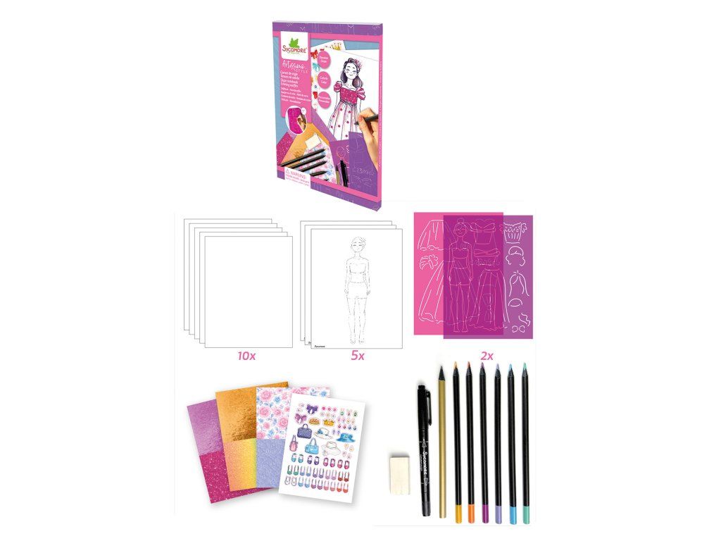 Sada obsahuje vše potřebné: 10 tištěných stránek s připravenými siluetami, na které můžete navrhnout vlastní oblečení 10 prázdných stránek pro volné kreslení a tvorbu, 6 barevných pastelek pro precizní detaily a barevné kombinace, 1 tužka HB pro kreslení a stínování, 1 tenký fix pro jemné detaily, 1 guma pro úpravy a korekce, 4 listy samolepek s potiskem látky (20 × 15 cm) pro rychlé vytvoření stylových doplňků, 1 list samolepek (20 × 15 cm) pro snadné přidání doplňků, 2 pružné plastové šablony (21 × 16 cm) s oblečením, doplňky a dekorativní prvky.