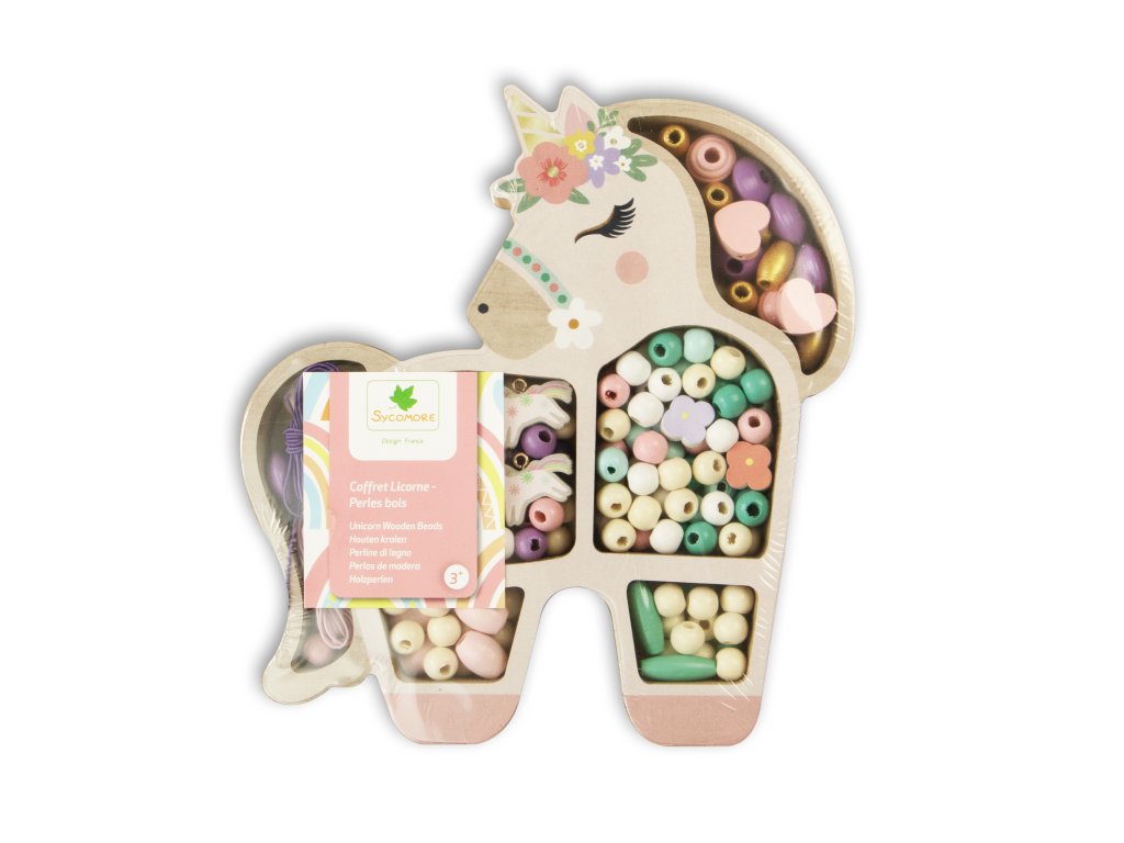 Dřevěné pastelové korálky uložené v krabičce ve tvaru jednorožce jsou krásný dárek pro děti od 3 let. Navlékání korálků napomáhá rozvoji jemné motoriky, koordinaci ruky a oka a navíc vyžaduje trpělivost a soustředění se na danou věc.
