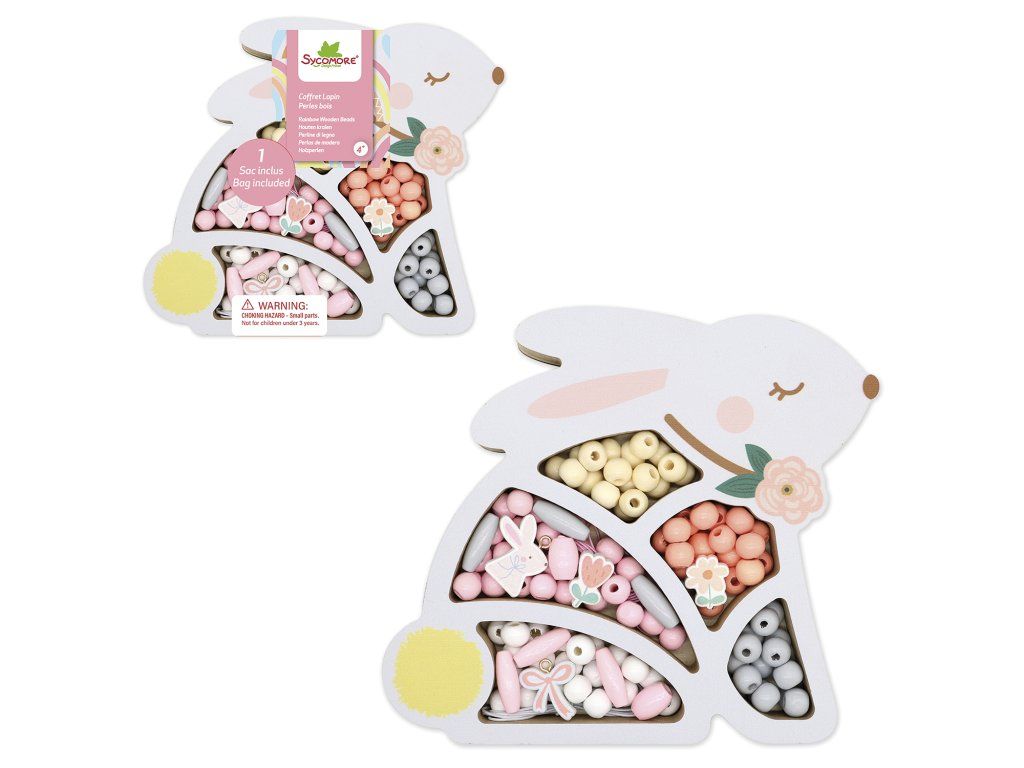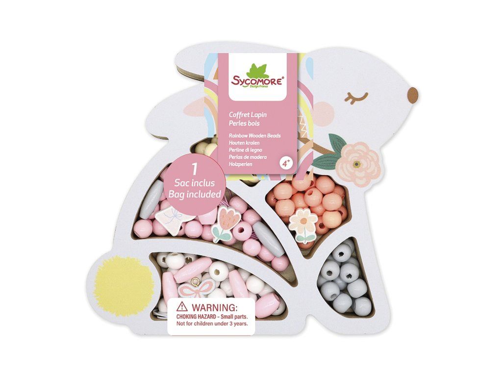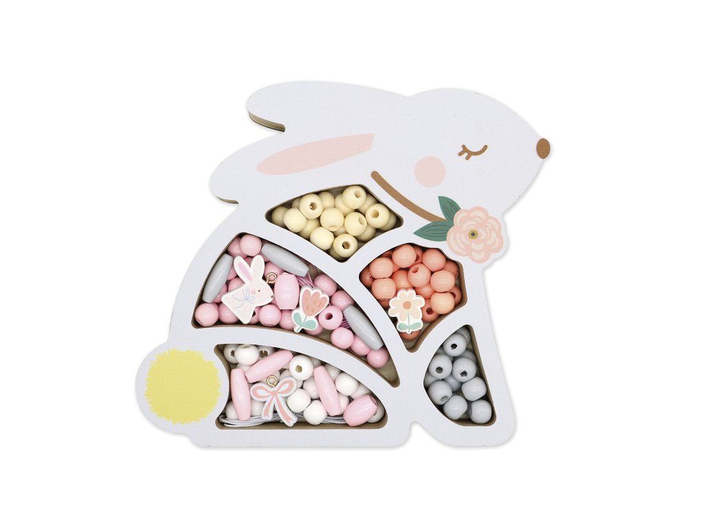 V atraktivním balení najdete dřevěné korálky v pastelových barvách, oválné korálky, přívěsky ve tvaru králíka a mašle, korálky ve tvaru květin, 3 metry provázku, sáček z organzy na uložení korálků. Vyrobeno ze dřeva pocházejícího z udržitelných zdrojů.