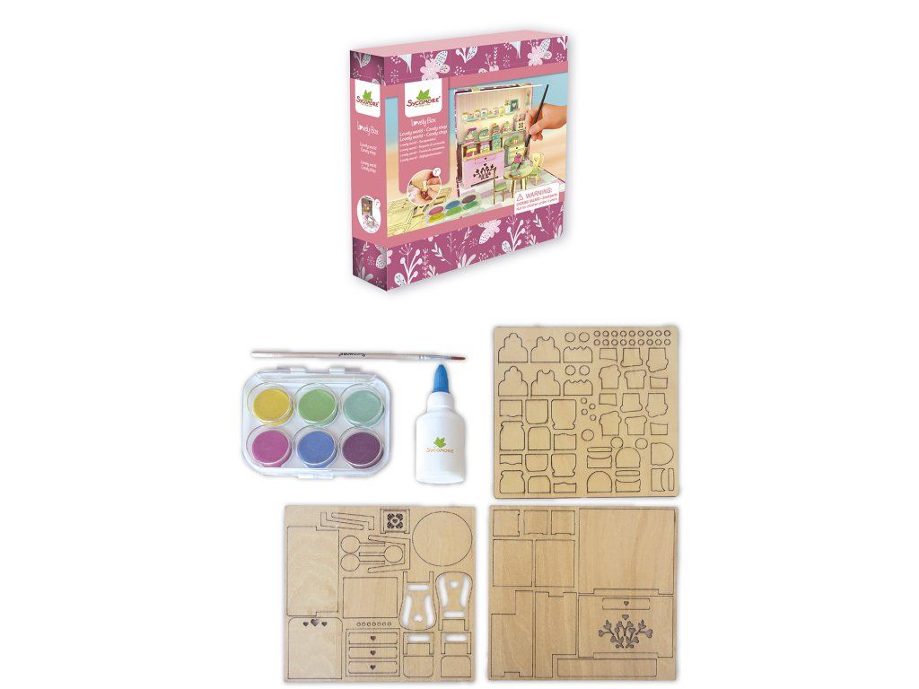 Vytvořte si mini útulnou cukrárnu v potištěné krabici, která slouží zároveň jako úložný box! Dřevěný nábytek si děti sestaví a nabarví. Sada obchodu se sladkostmi je speciálně navržena pro děti od 7 let, které milují tvoření a chtějí si postavit vlastní miniaturní svět.