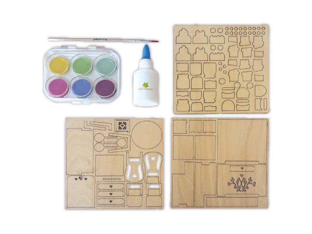 Sada obsahuje: předem nařezanou dřevěnou překližku, lepidlo, paletu 6 barev, 1 štětec, 10 dřevěných korálků ve tvaru dortíků a návod.