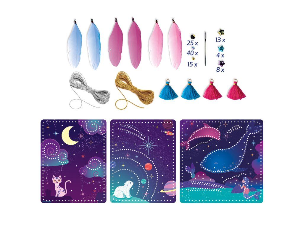 Obsah balení: 3 potištěné pohlednice, zlatá nit pro vyšívání, barevná peříčka (modrá, růžová, fialová), zlaté korálky a flitry, ozdoby a dekorace, podrobný návod krok za krokem, který vám ukáže, jak správně vyšívat a ozdobit pohlednice.