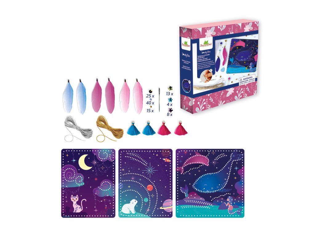 V této kreativní sadě najdete vše, co potřebujete k tomu, abyste si vytvořili 3 originální vyšívané pohlednice s nádhernými ilustracemi. Pohlednice si dotvoříte jemnými detaily, jako jsou zlatá nit, peříčka, flitry a korálky v různých tvarech, které přidají vašim výtvorům kouzelný nádech. Tato sada je ideální pro všechny, kteří si chtějí užít chvíle tvoření a zároveň vytvořit osobní a unikátní pohlednice. Určeno pro děti od 7 let.