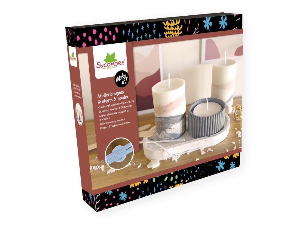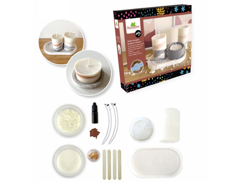 Kreativní volnočasová aktivita pro děti od 12 let. Sada obsahuje vše, co potřebujete k výrobě 2 originálních, moderních svíček ze sojového vosku a jesmonitového svícnu.