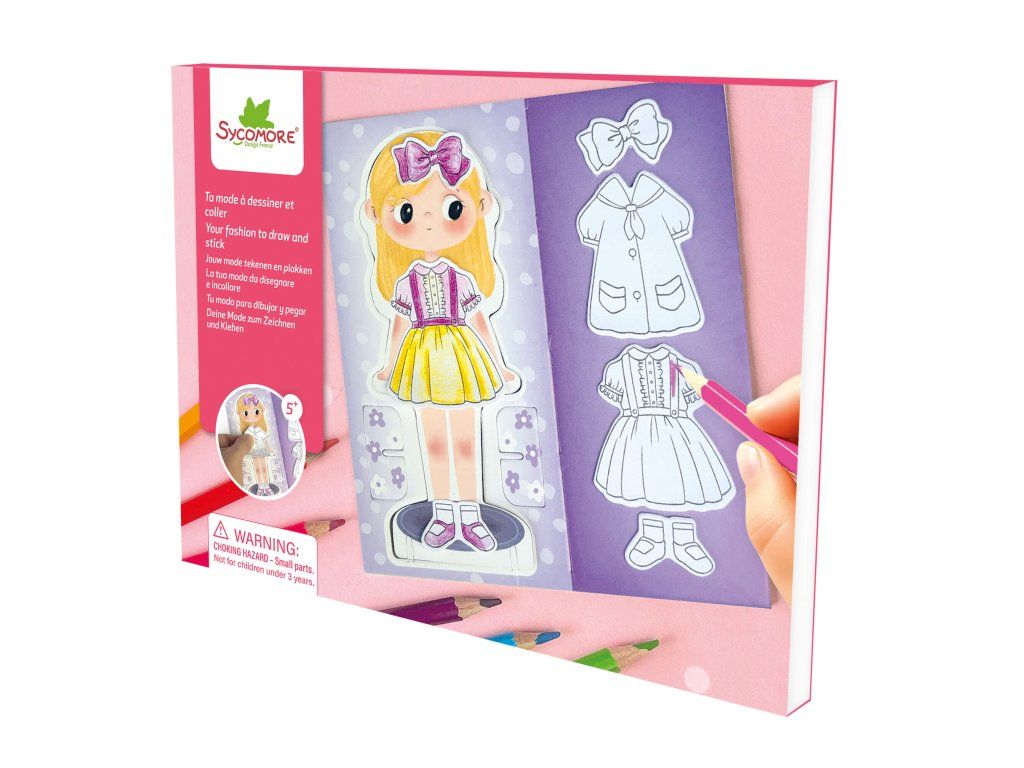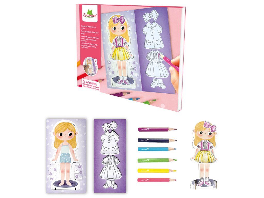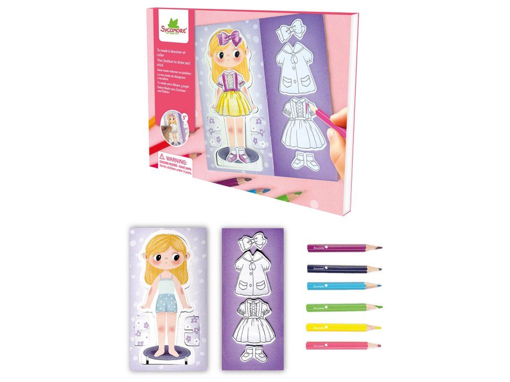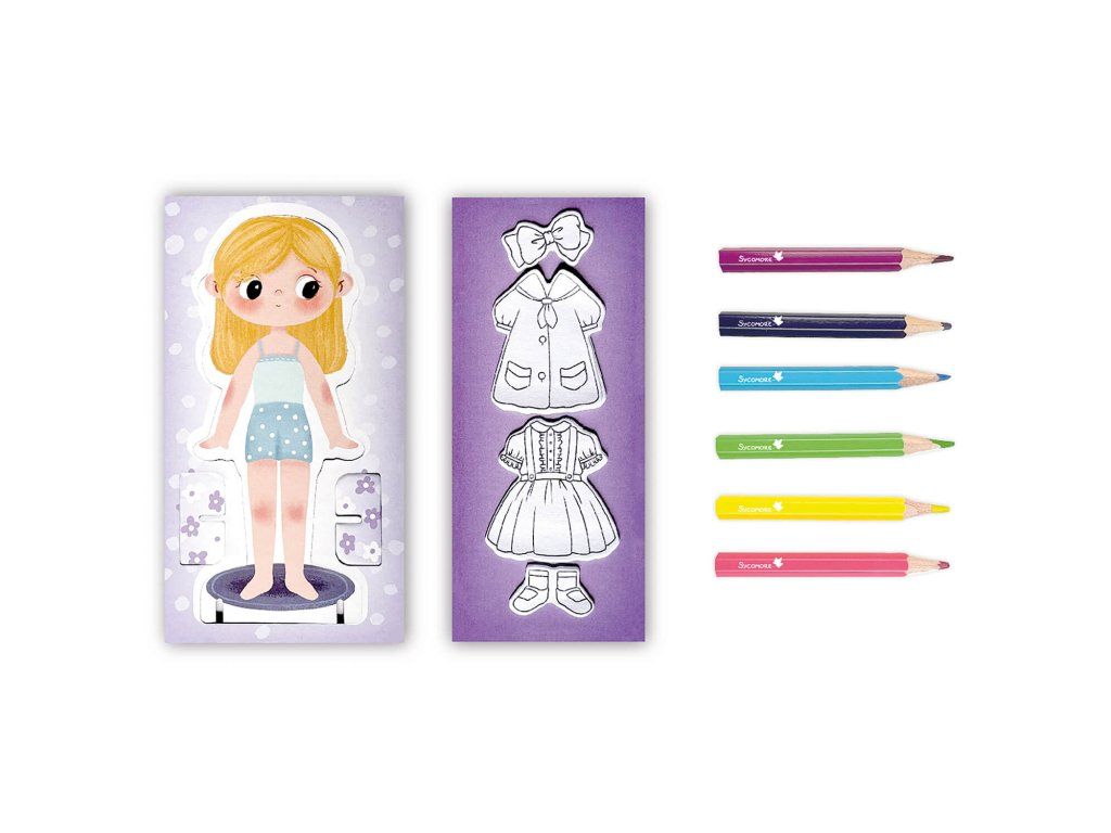 Tato zábavná sada pro malé stylistky od 5 let obsahuje kartonovou figurku a sadu samolepek ve tvaru oblečení a doplňků. Děti mohou oblečení vybarvit pomocí 6 přiložených barevných pastelek a poté je nalepit na figurku podle svého přání. Jednoduchá a opakovaně použitelná aktivita, která podporuje kreativitu a pomáhá rozvíjet jemnou motoriku u malých dětí. Ideální zábava na cestách!Doplňkové parametry