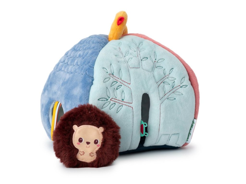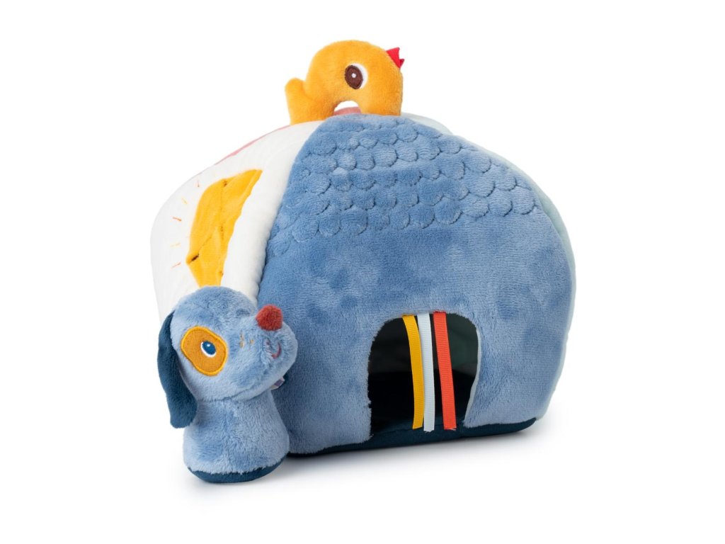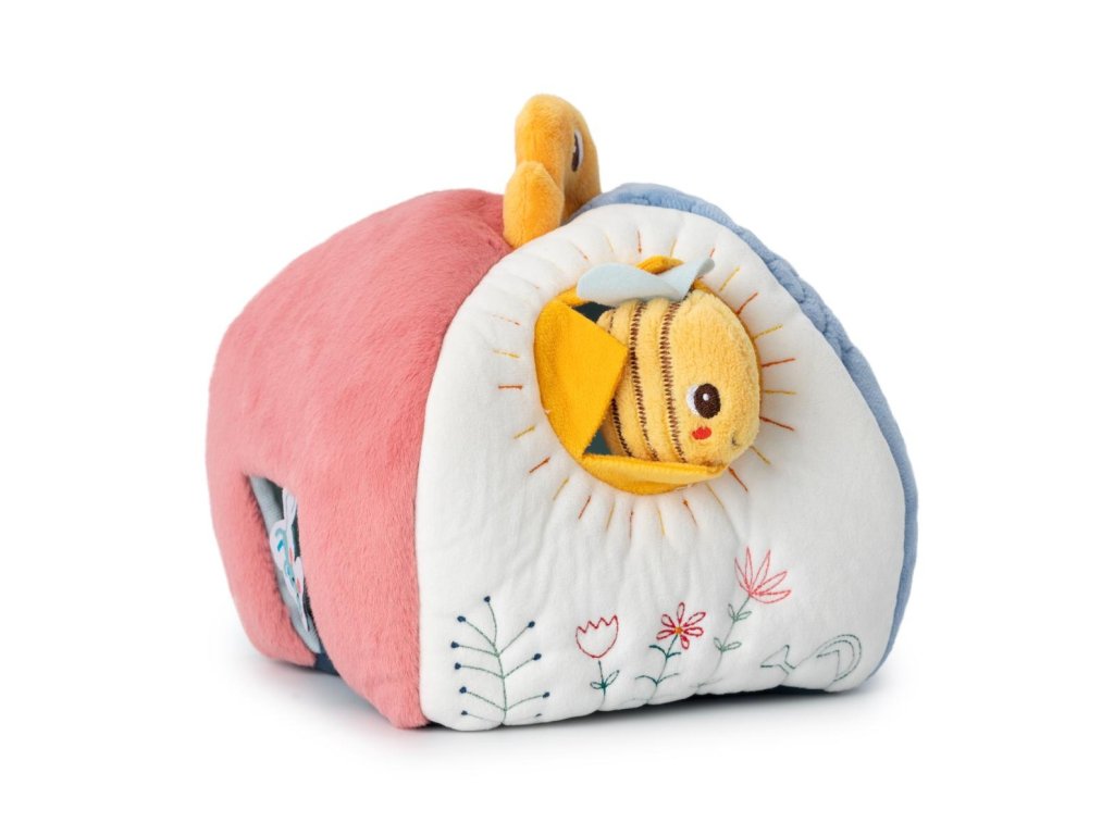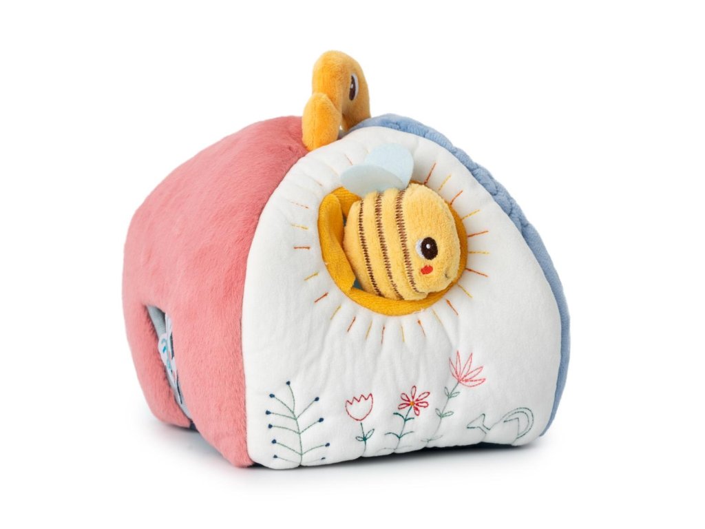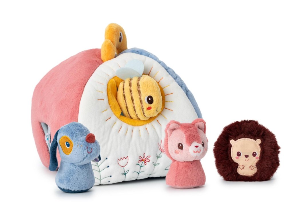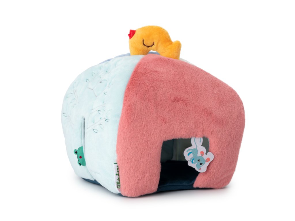 Kouzelný textilní domeček, který přináší nekonečné možnosti hry a objevování pro děti již od 9 měsíců. Tento hebký a barevný domeček má čtyři různé vchody, z nichž každý ukrývá jednoho zvířecího kamaráda: pejska, kočičku, ježka a včelku. Každé z těchto textilních zvířátek má v bříšku ukryté chrastítko, které vydává jedinečný zvuk. Ten děti nejen pobaví, ale také stimuluje jejich smyslové vnímání. Zábavná hra s přiřazováním zvířátek k odpovídajícím barvám nebo ilustracím na stranách domečku podporuje rozvoj logického myšlení a motorických schopností.