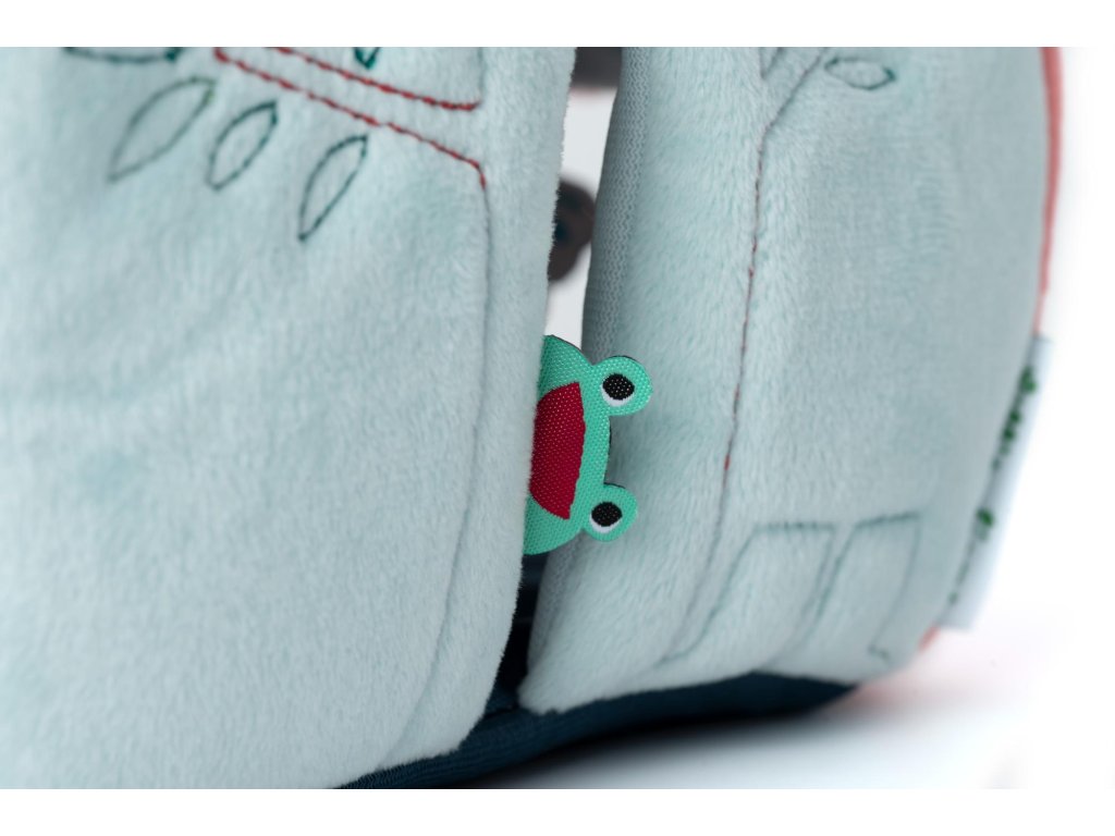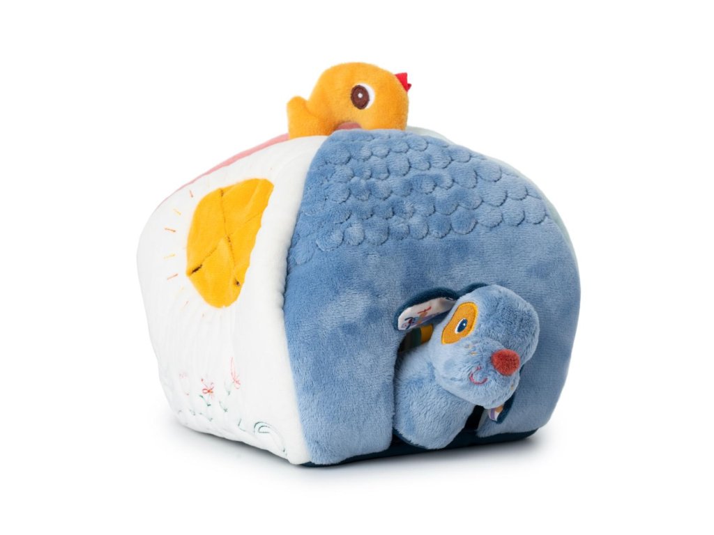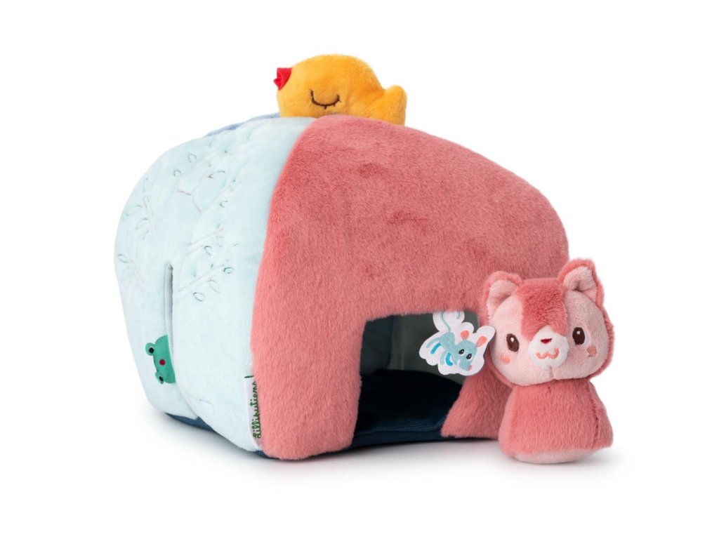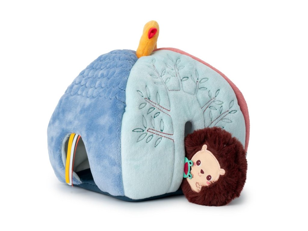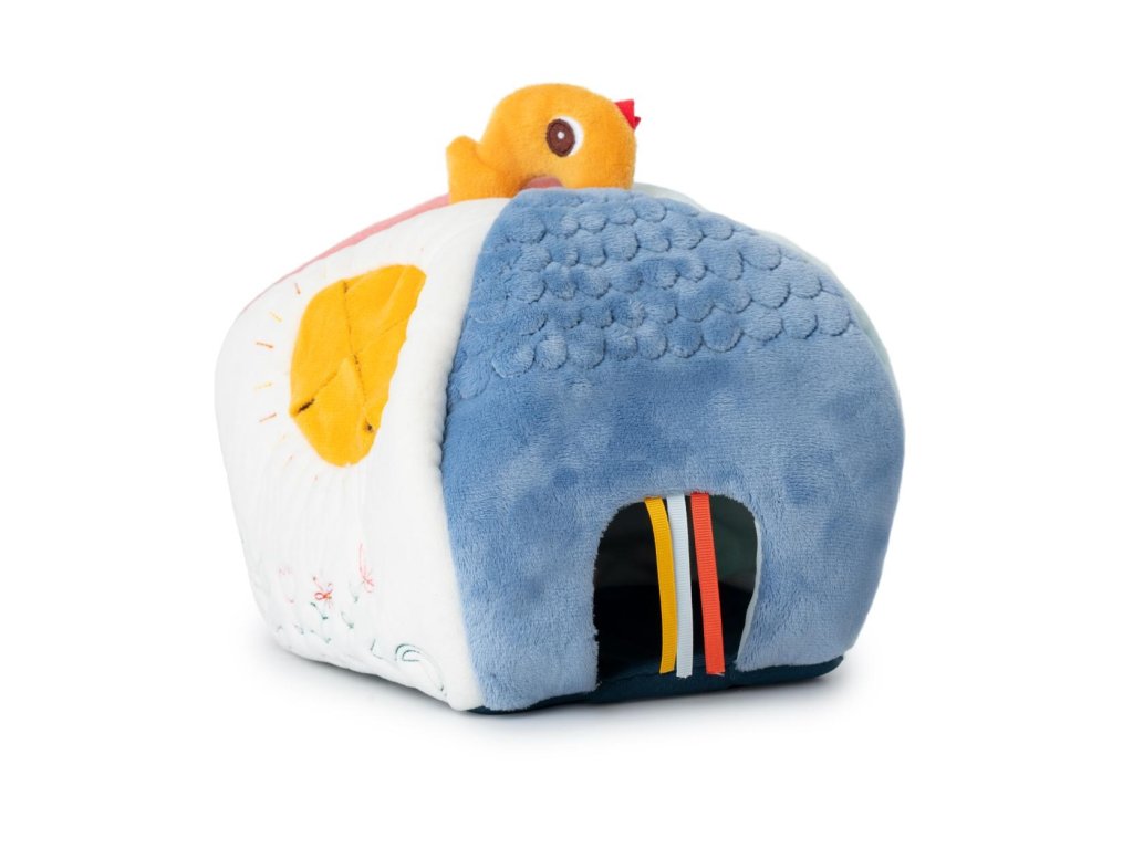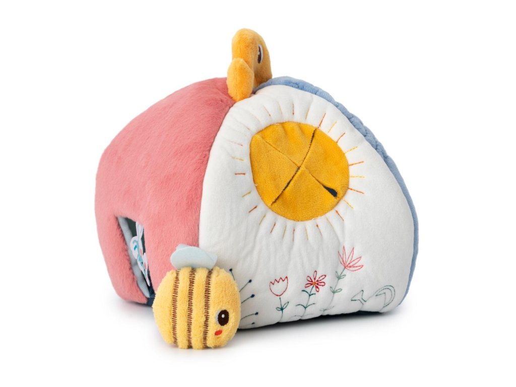 Kouzelný textilní domeček, který přináší nekonečné možnosti hry a objevování pro děti již od 9 měsíců. Tento hebký a barevný domeček má čtyři různé vchody, z nichž každý ukrývá jednoho zvířecího kamaráda: pejska, kočičku, ježka a včelku. Každé z těchto textilních zvířátek má v bříšku ukryté chrastítko, které vydává jedinečný zvuk. Ten děti nejen pobaví, ale také stimuluje jejich smyslové vnímání. Zábavná hra s přiřazováním zvířátek k odpovídajícím barvám nebo ilustracím na stranách domečku podporuje rozvoj logického myšlení a motorických schopností.