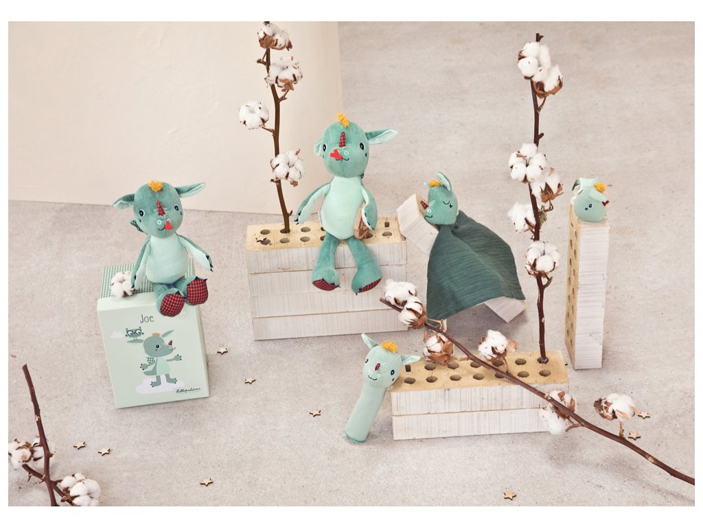 Dráček Joe v podobě pískací hračky je určena pro děti od 3 měsíců. Ideální hračka pro rozvoj motorických schopností malých dětí. Děti se učí jak funguje akce a reakce. Je potřeba zmáčknout bříško, abyste uslyšeli pískání. Rozměry hračky jsou 17 x 3,5 x 16,5 cm. Lze prát ručně. Hračka je lehounká. Vyrobeno ze 100 % bavlny.